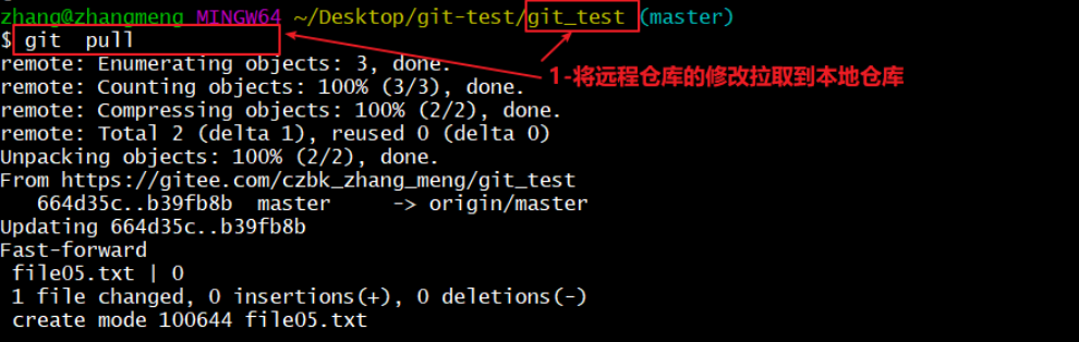 git pull [remote name] [branch name]- 拉取指令就是将远端仓库的修改拉到本地并自动进行合并,等同于 fetch+merge